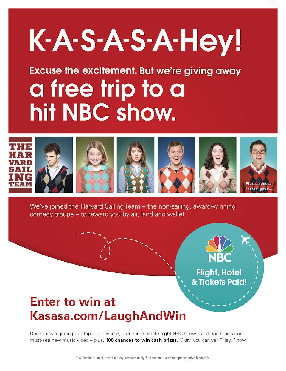 Goal: Promote a partnership with NBC and comedy troupe Harvard Sailing Team, including a grand prize trip to NBC studios for the filming of a hit show.