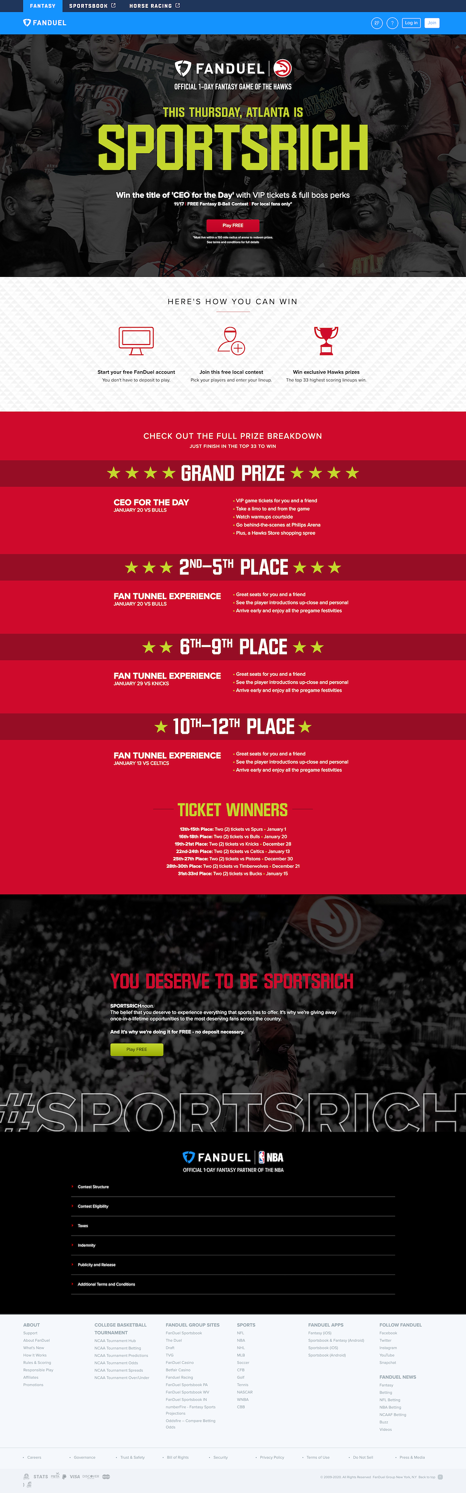 Contest landing page, templated structure — ran with different grand prizes for all NBA partner teams throughout the season (I'm just a Hawks fan).
