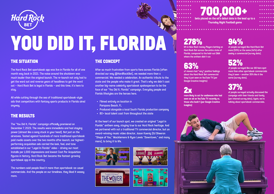 - Pull-through of our message (“Hard Rock Bet is legal in Florida”) was critical, given previous false starts and confusion over legality statewide
